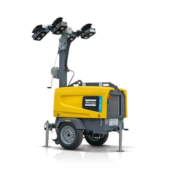 La torre de iluminación Atlas Copco HiLight V5+ cuenta con 4 lámparas LED de 350 W para iluminación eficiente de grandes áreas. Incorpora motor diésel Kubota Z482, mástil de 7.5 m con rotación de 360° y tanque de 105 L que permite hasta 150 h de autonomía, con 63 dB(A) a 7 m.